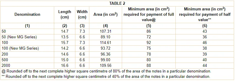 RBI की ऑफिशियल वेबसाइट पर दी गई जानकारी के मुताबिक, 2000 रुपये के नोट की लंबाई- 16.6 cm, चौड़ाई- 6.6 cm और एरिया 109.56 वर्ग सेंटीमीटर होता है। ऐसे में नोट के 88 वर्ग सेंटीमीटर होने पर पूरा पैसा मिलेगा। यदि नोट 44 वर्ग सेंटीमीटर है तो आधा ही रिफंड मिलेगा। वहीं 500 रुपये के नोट की लंबाई- 15 cm, चौड़ाई- 6.6 cm और एरिया 99 वर्ग सेंटीमीटर होता है। ऐसे में 500 रुपये के नोट यदि 80 वर्ग सेंटीमीटर है तो फुल रिफंड मिलेगा, जबकि 40 वर्ग सेंटीमीटर होने पर रिफंड आधा मिलेगा।