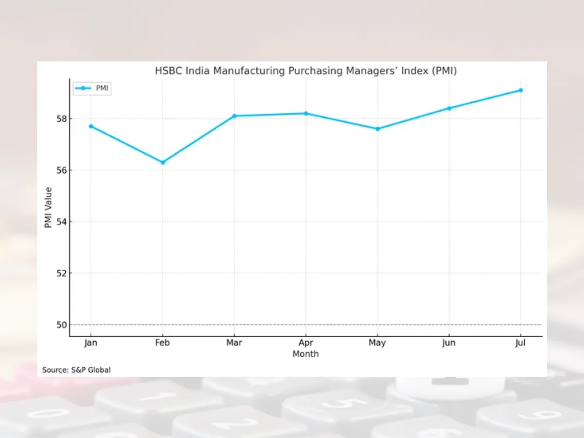 PMI Data: भारत का मैन्युफैक्चरिंग सेक्टर जुलाई में तेज़ी से बढ़ा है। एचएसबीसी इंडिया मैन्युफैक्चरिंग परचेजिंग मैनेजर्स’ इंडेक्स (PMI) जुलाई में बढ़कर 59.1 हो गया, जो जून में 58.4 था। यह आंकड़ा पिछले 16 महीनों में सबसे ऊंचा है। एसएंडपी ग्लोबल द्वारा जारी आंकड़ों के मुताबिक, नए ऑर्डर और प्रोडक्शन में मज़बूत वृद्धि की वजह से यह सुधार देखने को मिला।
