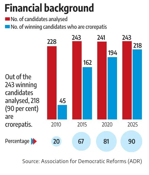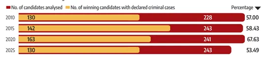 243 विजेता उम्मीदवारों में से 130 यानी 53% ने अपने ऊपर क्रिमिनल केस होने की जानकारी दी है। पिछले चुनाव 2020 में यह आंकड़ा ज्यादा था – 241 में से 163 विधायक यानी 68% ने अपने खिलाफ क्रिमिनल केस होने की घोषणा की थी।