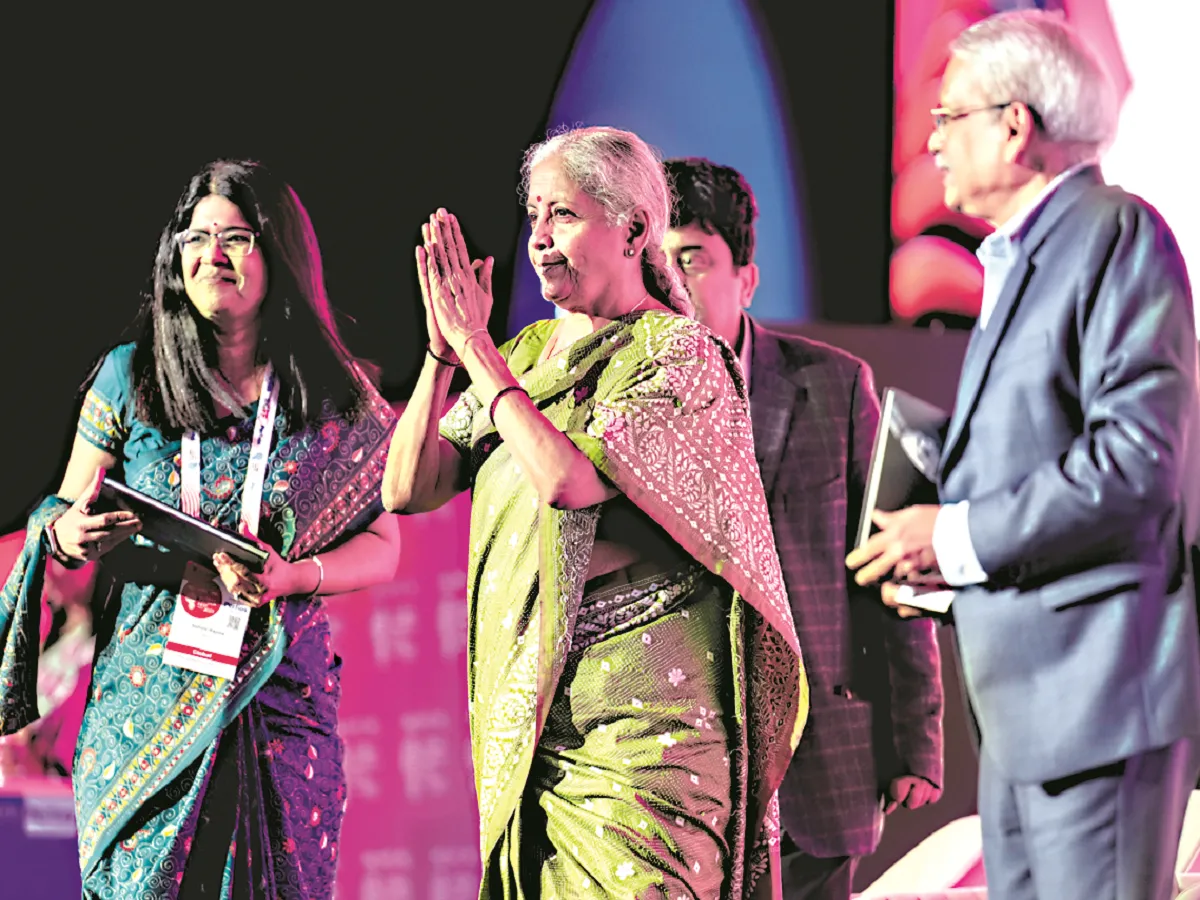मुंबई में ‘ग्लोबल फिनटेक फेस्ट 2025’ में उपस्थित लोगों का अभिवादन करती हुईं वित्त मंत्री निर्मला सीतारमण