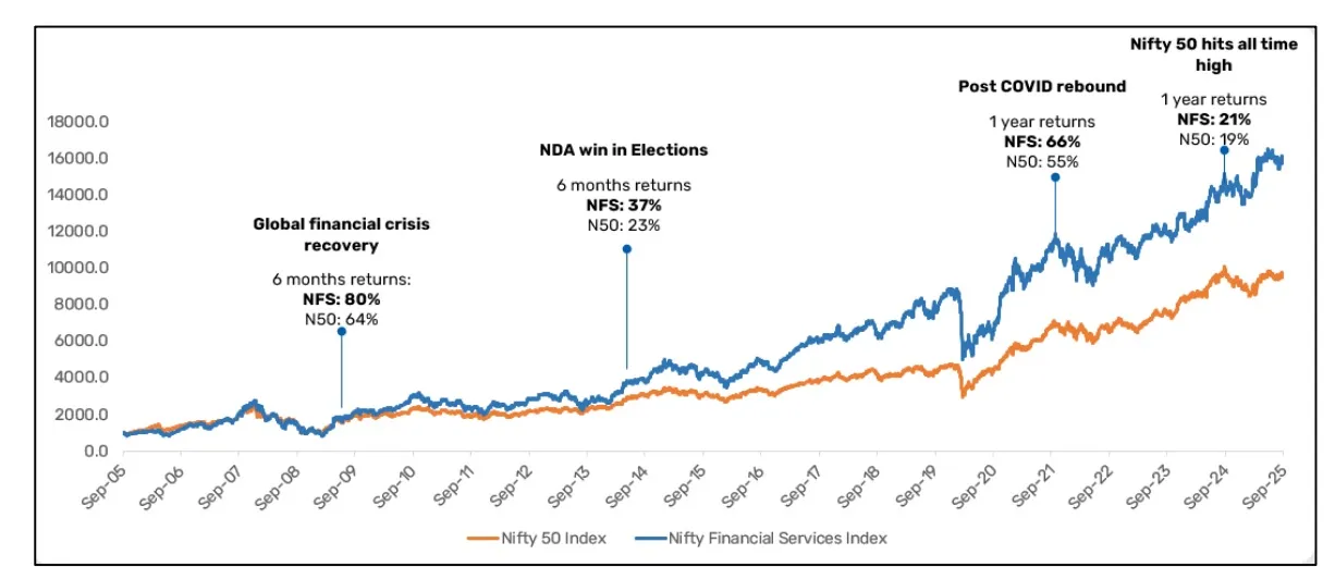 स्टडी में यह भी बताया गया है कि पिछले दो दशकों में बीएफएसआई सेक्टर ने लगातार व्यापक बाजार (broader market) से बेहतर प्रदर्शन किया है, जिसका उदाहरण निफ्टी फाइनेंशियल सर्विसेज (NFS) इंडेक्स और निफ्टी 50 के बीच तुलना में देखा जा सकता है। 2008 की आर्थिक मंदी के बाद 2009 में रिकवरी के दौरान, NFS इंडेक्स में सिर्फ छह महीनों में 80% की बढ़ोतरी हुई, जबकि निफ्टी 50 में यह वृद्धि 64% रही।