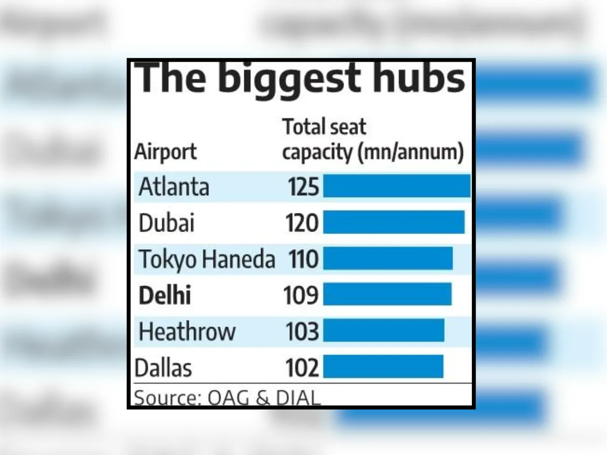 ओएजी (OAG) के ताजा आंकड़ों के मुताबिक, दुनिया के जिन एयरपोर्ट्स की क्षमता 10 करोड़ से ज्यादा है, उनमें अटलांटा (12.54 करोड़), दुबई (12 करोड़), टोक्यो हानेडा (11 करोड़), लंदन हीथ्रो (10.3 करोड़) और डलास (10.29 करोड़) शामिल हैं।