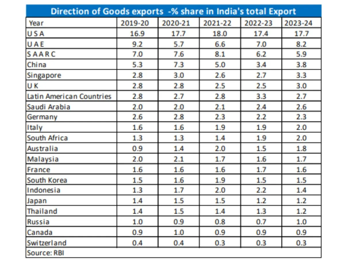 भारत और अमेरिका के बीच व्यापार अधिशेष (trade surplus) लगातार बढ़ रहा है। साल 2000 में यह सिर्फ 7 अरब डॉलर था, जो 2024 में बढ़कर 45.7 अरब डॉलर हो गया। अमेरिका अब भी भारत का सबसे बड़ा निर्यात बाजार बना हुआ है और वित्त वर्ष 2024 में भारत के कुल निर्यात का 17.7% हिस्सा अकेले अमेरिका को गया।
