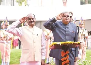 इससे पहले, केंद्रीय रिजर्व पुलिस बल (सीआरपीएफ) के संसदीय ड्यूटी ग्रुप ने धनखड़ और बिरला को ‘गार्ड ऑफ ऑनर’ दिया। धनखड़ ने समारोह के बाद कहा, ‘यह एक ऐतिहासिक क्षण है। भारत युग परिवर्तन का साक्षी बन रहा है। दुनिया भारत की ताकत, शक्ति और योगदान को पूरी तरह से पहचानती है।’ ध्वाजारोहण समारोह में पीयूष गोयल, प्रह्लाद जोशी और अर्जुन राम मेघवाल सहित कई केंद्रीय मंत्री तथा अन्य राजनीतिक दलों के नेता भी मौजूद रहे। कार्यक्रम के बाद धनखड़ और बिरला ने मेहमानों से बातचीत की। इस दौरान पृष्ठभूमि में सीआरपीएफ बैंड बज रहा था।