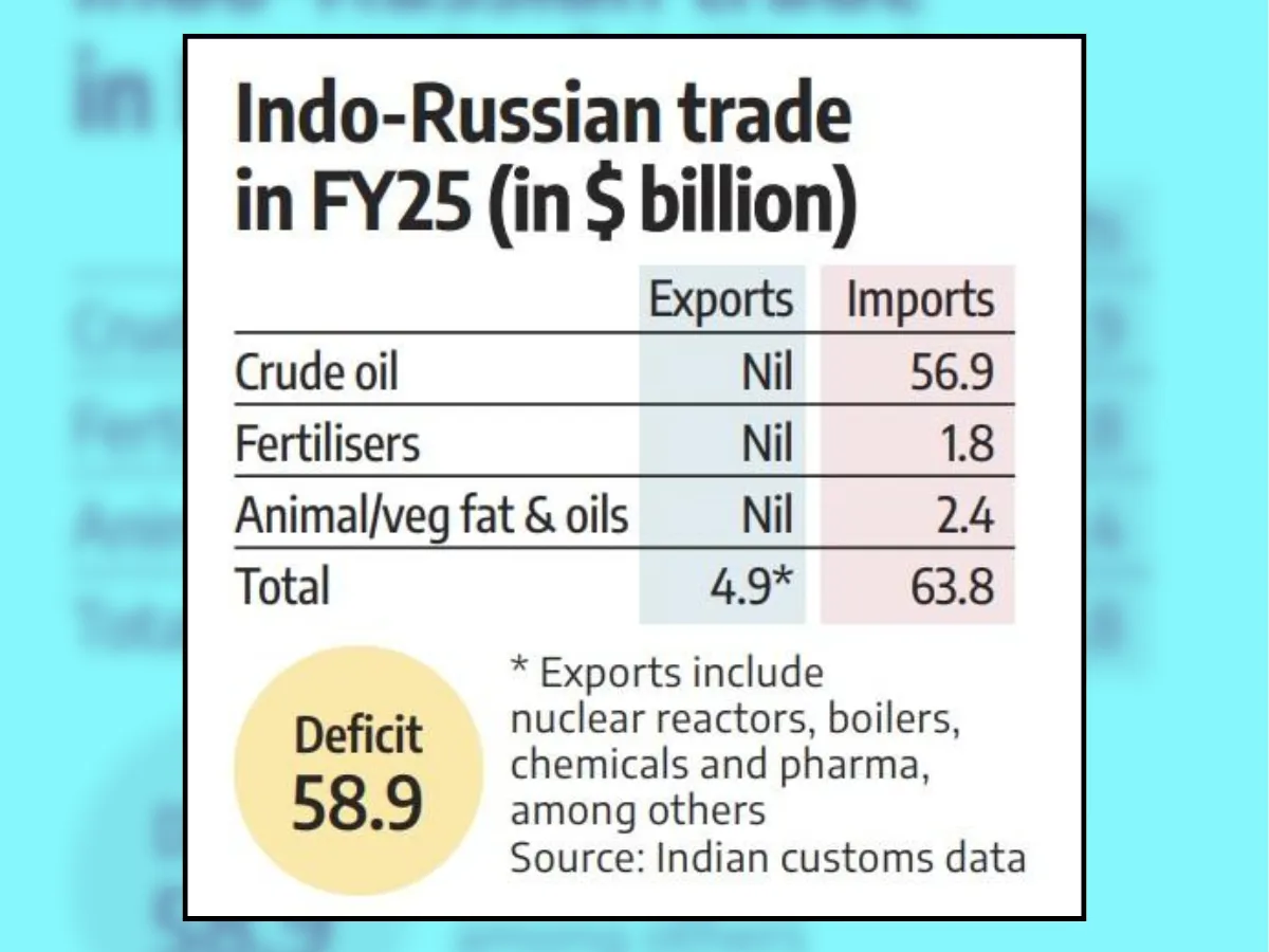 भारत और रूस के बीच कई दशकों से गहरे रिश्ते हैं। रूस के सैन्य उपकरण जैसे S-400 मिसाइल और ब्रह्मोस मिसाइल सिस्टम ने ऑपरेशन सिंदूर में भारत को पाकिस्तान पर बढ़त दिलाई थी। रूस की सरकारी कंपनी रोज़नेफ्ट ने 2017 में नायरा एनर्जी के लिए लगभग 13 अरब डॉलर का निवेश किया था, जो भारत के ऊर्जा क्षेत्र में सबसे बड़ा निवेश है। भारतीय रिफाइनर कंपनियों ने 2022 की शुरुआत से रूस से कच्चे तेल की खरीद पर 15 अरब डॉलर से ज्यादा की बचत की है। साथ ही, तमिलनाडु के कूडनकुलम में रूस के प्रेशराइज्ड वाटर रिएक्टर भारत के सबसे बड़े परमाणु बिजली केंद्र को चलाते हैं।