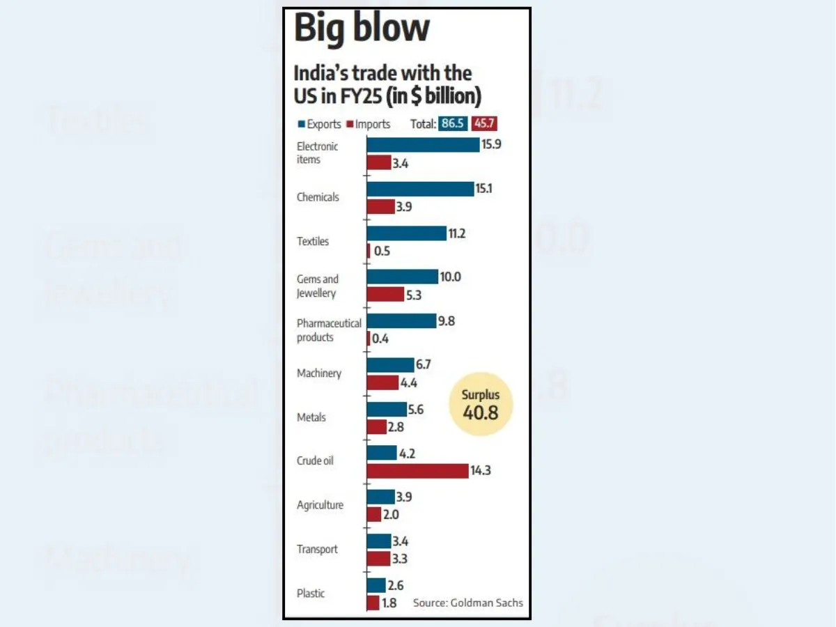 अमेरिका ने रूस से सस्ता तेल खरीदने पर भारत के अधिकांश निर्यात पर 25 प्रतिशत टैरिफ लगाया है। भारत के सबसे पुराने व्यापारिक साझेदार रूस से भारत की कच्चे तेल की करीब 40 प्रतिशत आपूर्ति होती है। इसके साथ ही 7 अगस्त से लगाया गया 25 प्रतिशत पारस्परिक टैरिफ मिलाकर, भारतीय निर्यातकों को अमेरिकी बाजार में पहुंचने के लिए कुल 50 प्रतिशत टैक्स देना होगा, जो ब्राजील के साथ सबसे अधिक है।