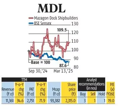 मजबूत ऑर्डर बुक, समय पर प्रोजेक्ट डिलीवरी और तीन साल की स्पष्ट रेवेन्यू विजिबिलिटी को देखते हुए, निर्मल बंग रिसर्च ने MDL के स्टॉक पर अपनी रेटिंग ‘होल्ड’ से बढ़ाकर ‘बाय’ कर दी है।