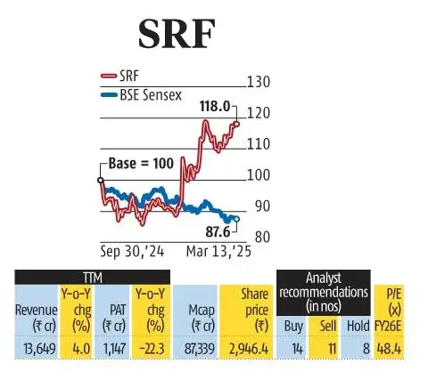 देश की सबसे बड़ी लिस्टेड स्पेशियलिटी केमिकल्स कंपनी SRF ने कुछ कमजोर तिमाहियों के बाद दिसंबर तिमाही में मजबूत नतीजे पेश किए हैं। कंपनी के केमिकल बिजनेस में मार्च तिमाही में और सुधार की उम्मीद है, खासकर स्पेशियलिटी केमिकल्स सेगमेंट में।