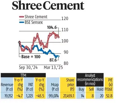 श्री सीमेंट के शेयरों में हाल के महीनों में मजबूती देखने को मिली है, जबकि पिछले पांच वर्षों में यह प्रदर्शन में पिछड़ रहा था। सितंबर 2024 के अंत से अब तक कंपनी के शेयरों में 6% की बढ़ोतरी हुई है, जो व्यापक बाजार और प्रमुख इंडेक्स की तुलना में बेहतर प्रदर्शन है।