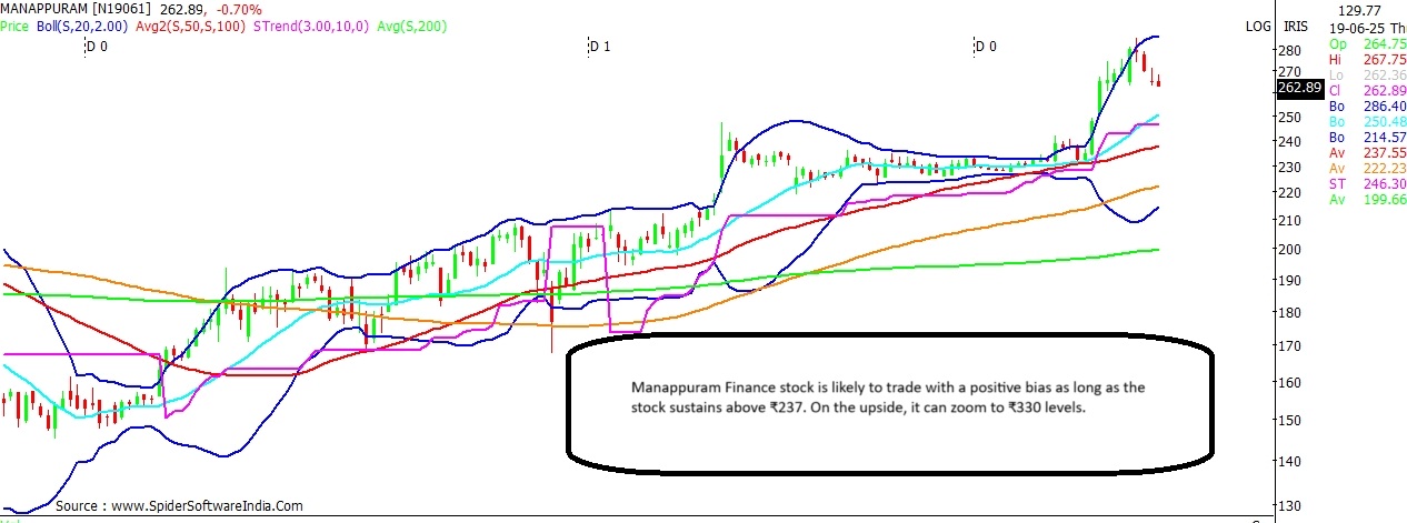Manappuram Finance का शेयर अभी ₹264 पर कारोबार कर रहा है। टेक्निकल चार्ट के मुताबिक, जब तक यह शेयर ₹254 के ऊपर बना रहता है, तब तक इसका रुख सकारात्मक माना जाएगा। इसके नीचे सपोर्ट ₹246 और ₹237 पर हैं। अगर शेयर ₹271 के ऊपर टिककर ट्रेड करता है, तो यह दोबारा तेजी पकड़ सकता है। ऊपर की ओर इसमें ₹285, ₹297 और ₹321 के स्तर पर रुकावट आ सकती है। विश्लेषकों के मुताबिक, लंबी अवधि में यह शेयर ₹330 तक जा सकता है, यानी यहां भी 25% तक की तेजी की गुंजाइश बनी हुई है। CLICK HERE FOR THE CHART
