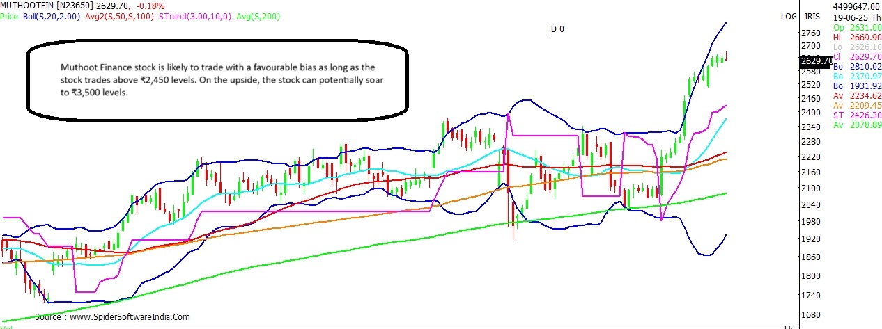 Muthoot Finance का मौजूदा शेयर प्राइस ₹2,645 है। टेक्निकल चार्ट के अनुसार, यह शेयर ₹2,450 के ऊपर टिकता है तो इसका ट्रेंड पॉजिटिव बना रहेगा। शेयर के लिए सपोर्ट स्तर ₹2,590, ₹2,550 और ₹2,450 हैं। अगर शेयर ऊपर चढ़ता है तो ₹2,955, ₹3,155, ₹3,290 और ₹3,400 के आसपास रुकावट आ सकती है। चार्ट विश्लेषण का कहना है कि अगले 6 महीनों में यह शेयर ₹3,500 तक पहुंच सकता है, यानी करीब 32.3% का अपसाइड पॉसिबल है। CLICK HERE FOR THE CHART