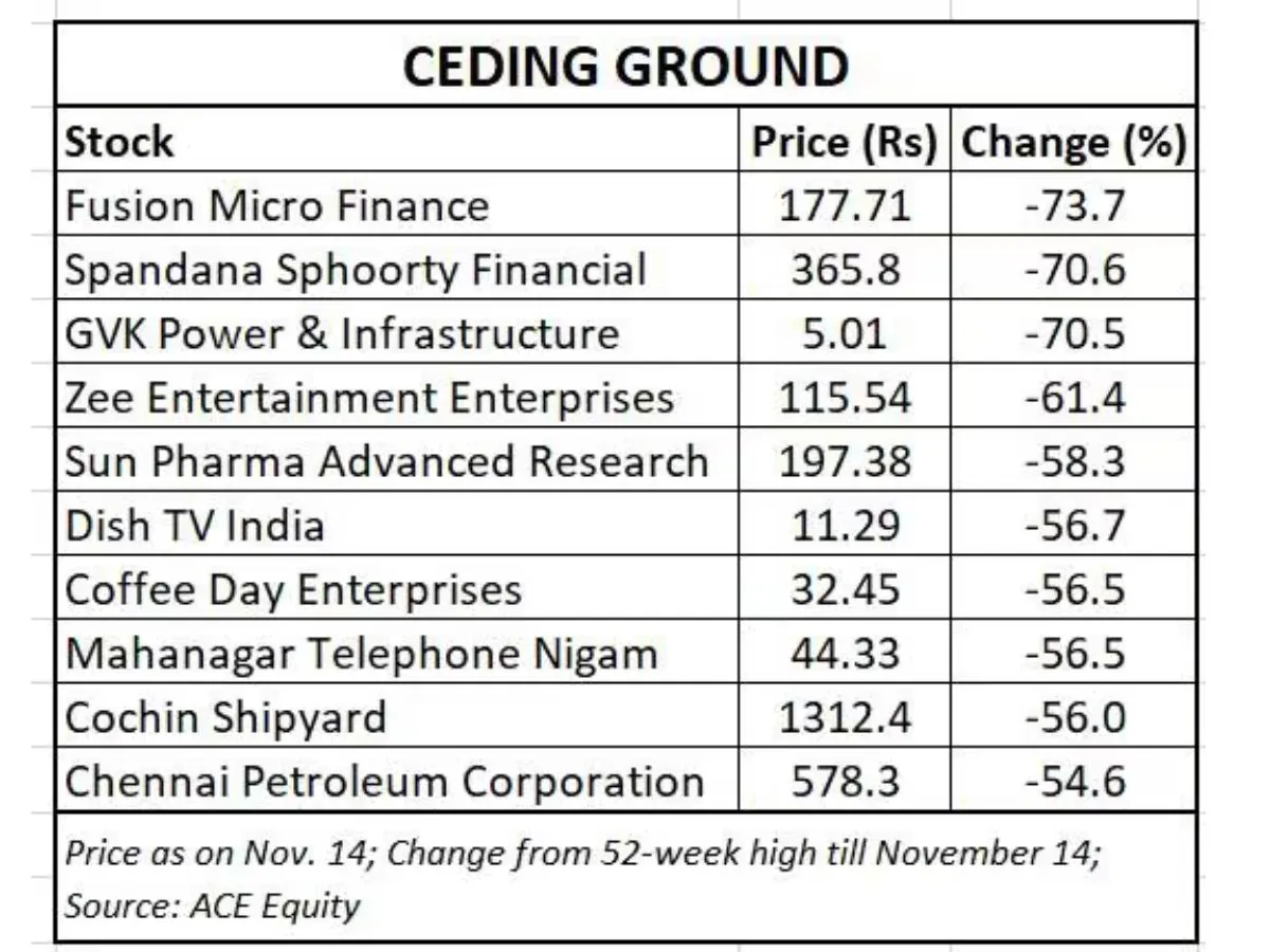 फ्यूज़न माइक्रो फाइनेंस, स्पंदना स्फूर्ति फाइनेंशियल और जीवीके पावर एंड इंफ्रास्ट्रक्चर अपने 52-वीक हाई से सबसे ज्यादा गिरे हैं और इनकी बाजार वैल्यू 70 प्रतिशत से अधिक घट गई है। इसके अलावा, ज़ी एंटरटेनमेंट एंटरप्राइजेज, सन फार्मा एडवांस्ड रिसर्च कंपनी (SPARC), इंडिया पेस्टिसाइड्स, डिश टीवी इंडिया, MTNL और चेन्नई पेट्रोलियम कॉर्पोरेशन जैसे प्रमुख स्टॉक्स 52-वीक हाई से 54 प्रतिशत से 69 प्रतिशत तक गिर गए हैं।