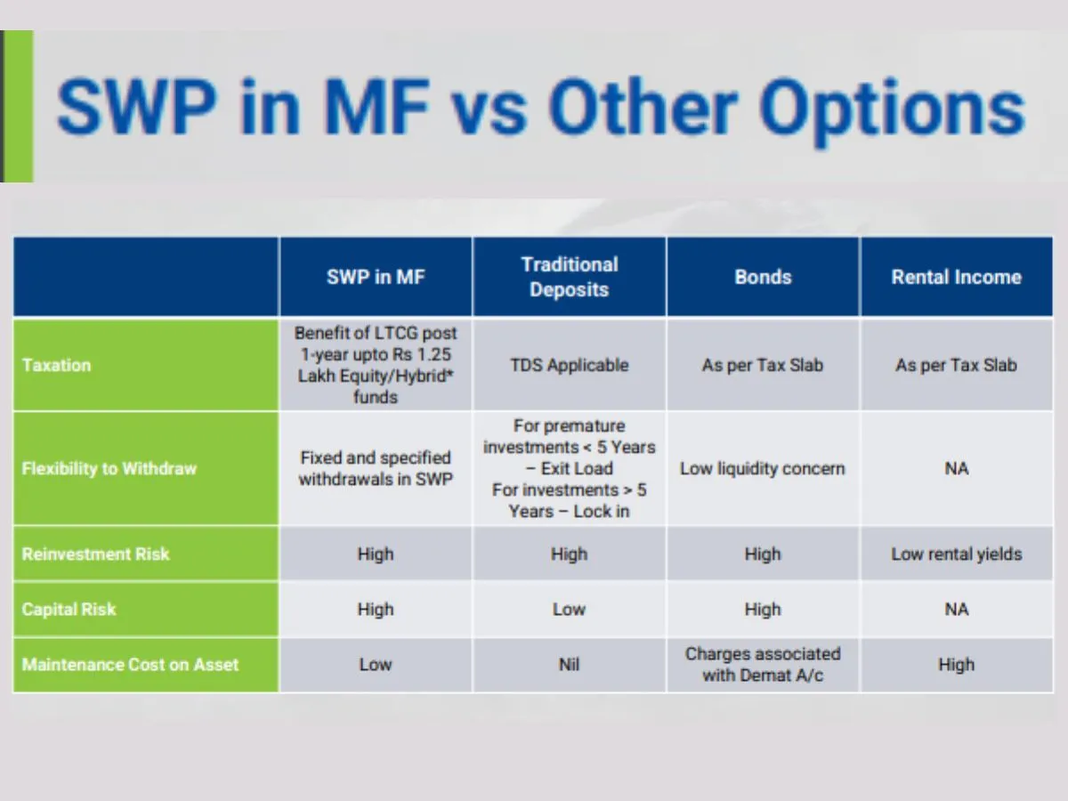 SWP की तुलना पारंपरिक जमा (FD), बॉन्ड और किराए से होने वाली आय जैसे निवेश विकल्पों से करने पर इसके कई फायदे सामने आते हैं। SWP टैक्स के मामले में फायदेमंद है क्योंकि इसमें एक साल बाद लॉन्ग-टर्म कैपिटल गेन (LTCG) पर 1.25 लाख तक की छूट मिलती है। जबकि FD पर TDS देना होता है। वहीं, बॉन्ड और रेंटल इनकम पर आपके टैक्स स्लैब के हिसाब से टैक्स लगेगा।