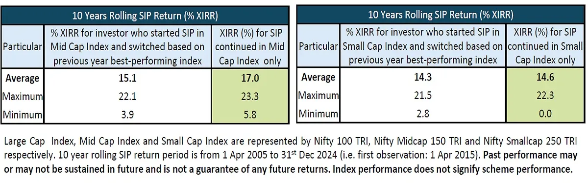 बाएं भाग में, निवेशक ने मिड कैप इंडेक्स में SIP शुरू किया और हर साल सबसे अच्छा प्रदर्शन करने वाले इंडेक्स में स्विच किया। इसका औसत रिटर्न 15.1% रहा, जबकि अधिकतम 22.1% और न्यूनतम 3.9% था। वहीं, अगर SIP केवल मिड कैप इंडेक्स में जारी रखी गई होती, तो औसत रिटर्न 17.0%, अधिकतम 23.3% और न्यूनतम 5.8% होता।