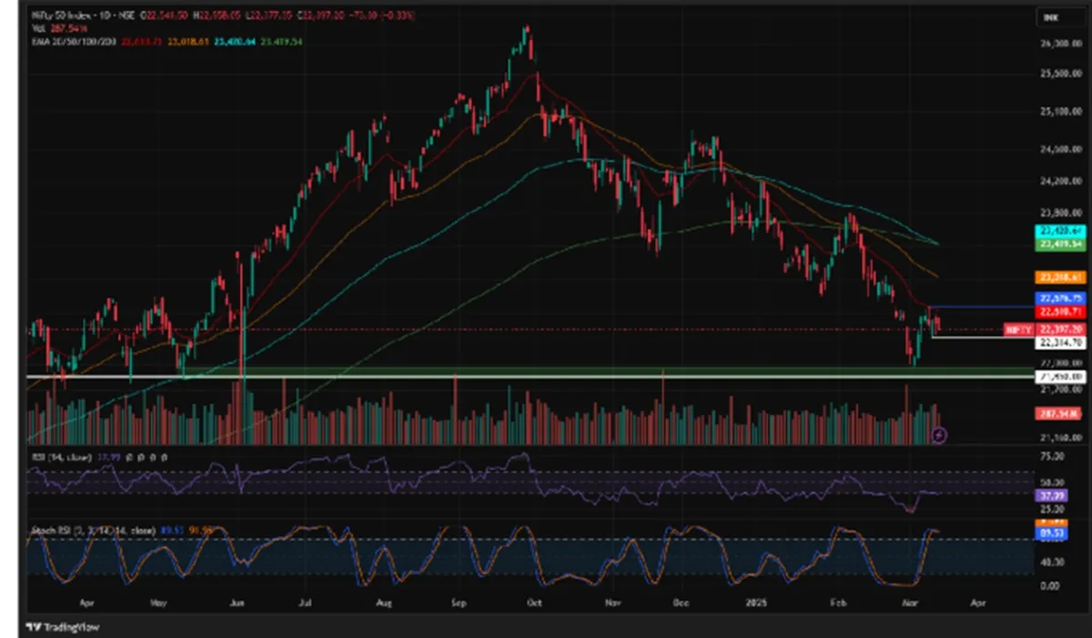 ब्रोकरेज के अनुसार, नीचे की ओर निफ्टी को 22,150 के लेवल पर मजबूत समर्थन दिख रहा है। इसके बाद यह लेवल 22,000 पर है। इन स्तरों से नीचे जाने पर आगे और भी कमज़ोरी आ सकती है। इससे बिक्री दबाव बढ़ सकता है। हालांकि, जब तक इंडेक्स इन समर्थन स्तरों से ऊपर बना रहता है, तब तक ब्रोडर तेजी का ढांचा बरकरार रहता है। निवेशकों को ट्रेंड की आगे की दिशा परखने के लिए इन स्तरों के आसपास प्राइस एक्शन पर बारीकी से नज़र रखनी चाहिए।