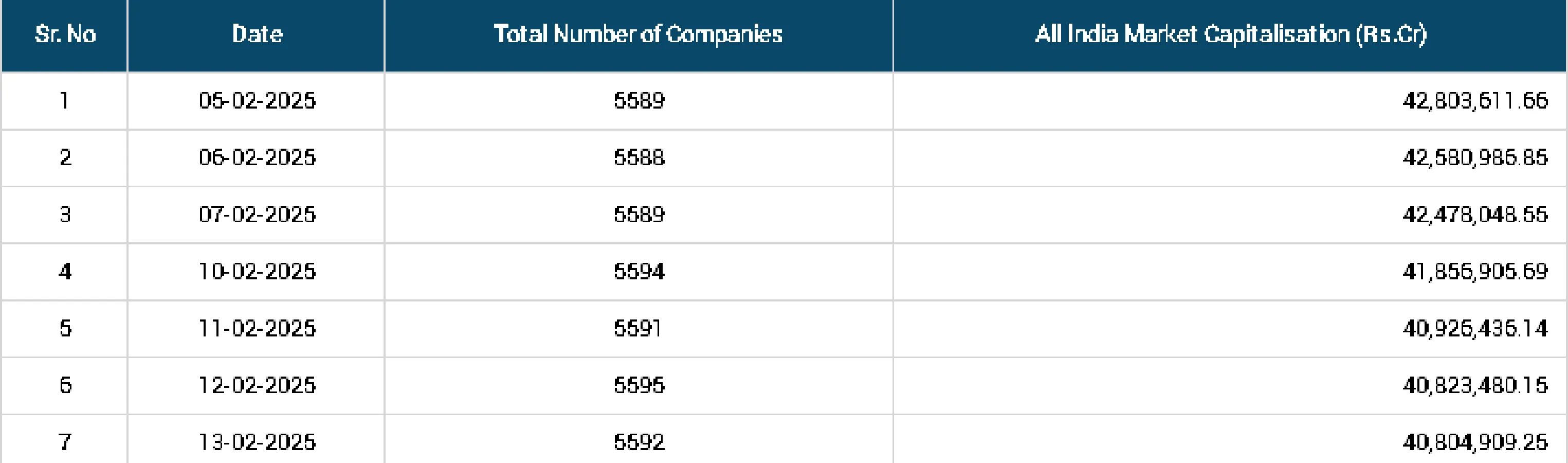भारतीय शेयर बाजार का मार्केट कैप पिछले बुधवार को 42,803,611 करोड़ रुपये था। जबकि गुरुवार को यह घटकर 42,580,986 करोड़ रुपये पर, शुक्रवार को 42,478,048 करोड़ रुपये पर, सोमवार को 41,856,905 करोड़ रुपये, मंगलवार को 40,926,436 करोड़ रुपये, बुधवार को 40,823,480 करोड़ रुपये और गुरुवार को घटकर 40,804,909 करोड़ रुपये रह गया था। शुक्रवार को बाजार में ताजा गिरावट के बाद यह 3,99,74,912 करोड़ रुपये आ गया।