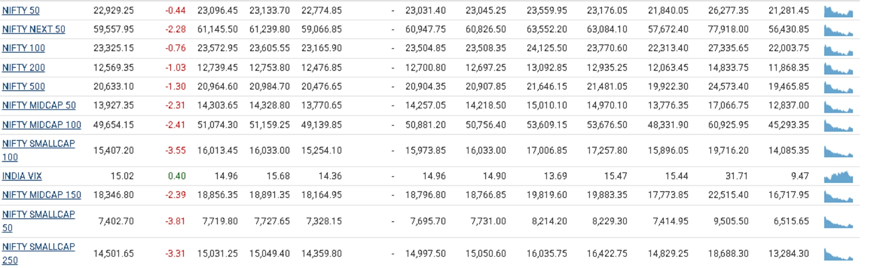 कैपिटलमाइंड रिसर्च में सीनियर रिसर्च एनालिस्ट कृष्णा अप्पला ने कहा कि सप्ताह के दौरान सभी इंडेक्स में बड़ी गिरावट देखी गई है। 5 फरवरी, 2025 के बाद से निफ्टी 50 इंडेक्स लगभग 4% गिर गया है, जो अब सितंबर 2024 के अपने रिकॉर्ड हाई से लगभग 13% नीचे है।