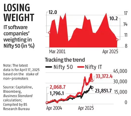 इस गिरावट के चलते निफ्टी 50 में आईटी सेक्टर का वेटेज अब सिर्फ 10.2% रह गया है, जो पिछले 17 सालों में सबसे कम है। यह मार्च 2008 के रिकॉर्ड न्यूनतम 9.7% के बेहद करीब है, जब वैश्विक वित्तीय संकट से पहले बाजार में उथल-पुथल थी। मार्च 2022 में यह वेटेज 17.7% था यानी दो साल में इसमें करीब 42% की गिरावट आई है।