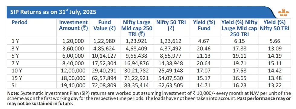फंड की फैक्टशीट के मुताबिक, 31 जुलाई 2025 तक, इस फंड का एसेट अंडर मैनेजमेंट (AUM) 4864.89 करोड़ रुपये था। फंड के फोलियो की संख्या 3,79,539 थी। इस स्कीम ने पिछले 1 साल में -5.04%, 3 साल में 22.14%, और 5 साल में 25.92% का CAGR रिटर्न दिया है। बाजार में डेब्यू के बाद से फंड ने 15.06% का सालाना रिटर्न दिया है।