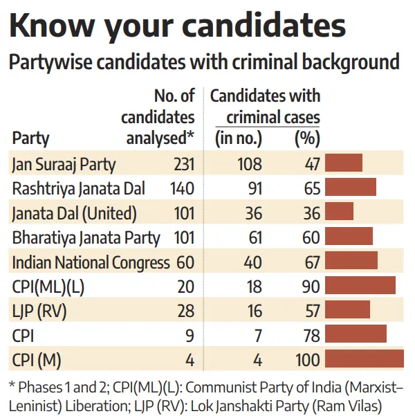 विश्लेषण में पता चला कि 838 उम्मीदवारों (32 प्रतिशत) ने अपने खिलाफ आपराधिक मामले दर्ज होने की जानकारी दी है। तुलना करें तो 2020 के बिहार विधानसभा चुनाव में 3,722 उम्मीदवारों में से 1,201 (32 प्रतिशत) उम्मीदवारों ने आपराधिक मामलों की जानकारी दी थी।