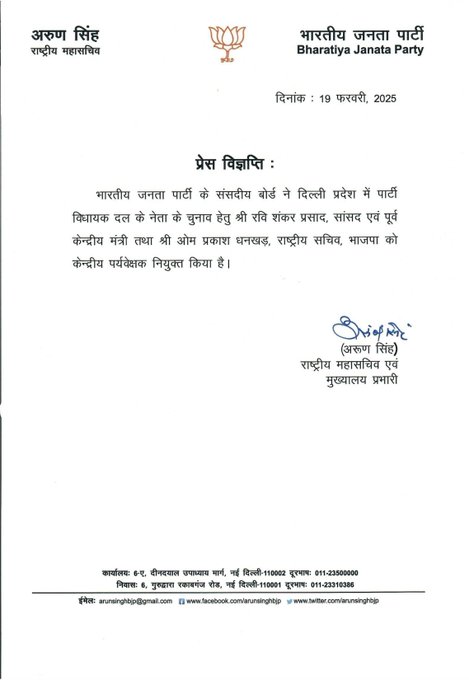 बुधवार को भाजपा केंद्रीय कार्यालय ने आधिकारिक पत्र जारी करते हुए पूर्व केंद्रीय मंत्री और बिहार से लंबे समय से राज्यसभा-लोकसभा के सांसद रहे रविशंकर प्रसाद और हरियाणा बीजेपी के कद्दावर नेता एवं बीजेपी के राष्ट्रीय सचिव ओपी धनखड़ को पर्यवेक्षक नियुक्त करने की घोषणा की। दिल्ली विधानसभा चुनाव के बाद इन दोनों पदाधिकारियों की जिम्मेदारी थी कि ये 70 सदस्यीय दिल्ली विधानसभा में चुने गए भाजपा के 48 विधायकों (MLAs) से बात करें और दिल्ली के नए मुख्यमंत्री के नाम पर आम-सहमति बनाए।