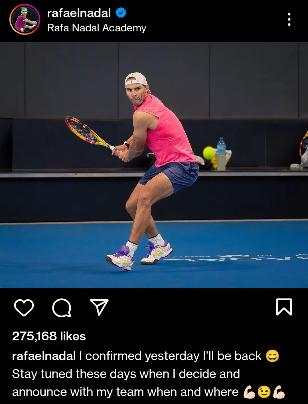 नडाल ने गुरुवार को सोशल मीडिया पर लिखा,‘‘मैंने कल पुष्टि की कि मैं वापसी करूंगा। मेरे साथ बने रहे।’’ उन्होंने कहा,‘‘मैं कब और कहां वापसी करूंगा, इसकी घोषणा जल्द की जाएगी।’’